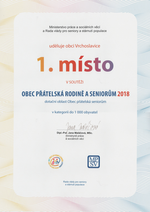 Aktuálním tématem se díky stárnutí populace a dalšímu předpokládanému růstu počtu seniorů v příštích letech stává politika na podporu stárnutí. Ve 20. století se vlivem změn populačního chování změnil pohled na proces a období stárnutí. Změnu ovlivnilo i zdokonalení zdravotnické péče, duševní a psychické hygieny a proměna životního stylu. Úmrtí se posunulo do pozdějšího věku. Navíc dochází ve většině vyspělých společností k poklesu porodnosti a plodnosti. Výsledkem je delší naděje dožití a častější dožívání se vysokého věku. Proto schválilo zastupitelstvo obce Vrchoslavice na svém zasedání Nový „Plán rozvoje rodinné politiky pro období 2018 – 2028“ a „Plán (koncepci) politiky na podporu stárnutí pro období 2018 – 2028“. Po úspěšném získání titulu "Obec přátelská rodině 2017" se obci podařilo v roce 2018 získat titul "Obec přátelská rodině a seniorům 2018" za I. místo v kategorii do 1000 obyvatel. Díky tomu mohla obec navázat na opatření z minulých let. V roce 2018 to bylo v hlavním opatření pořízení židlí a stolů pro pořádání akcí pro seniory. Obec pořádá pro seniory ročně 10 až 15 akcí, kdy si musela židle a stoly složitě půjčovat. Navíc se jednalo o staré vybavení, které bylo na hranici životnosti a má sníženou bezpečnost.
